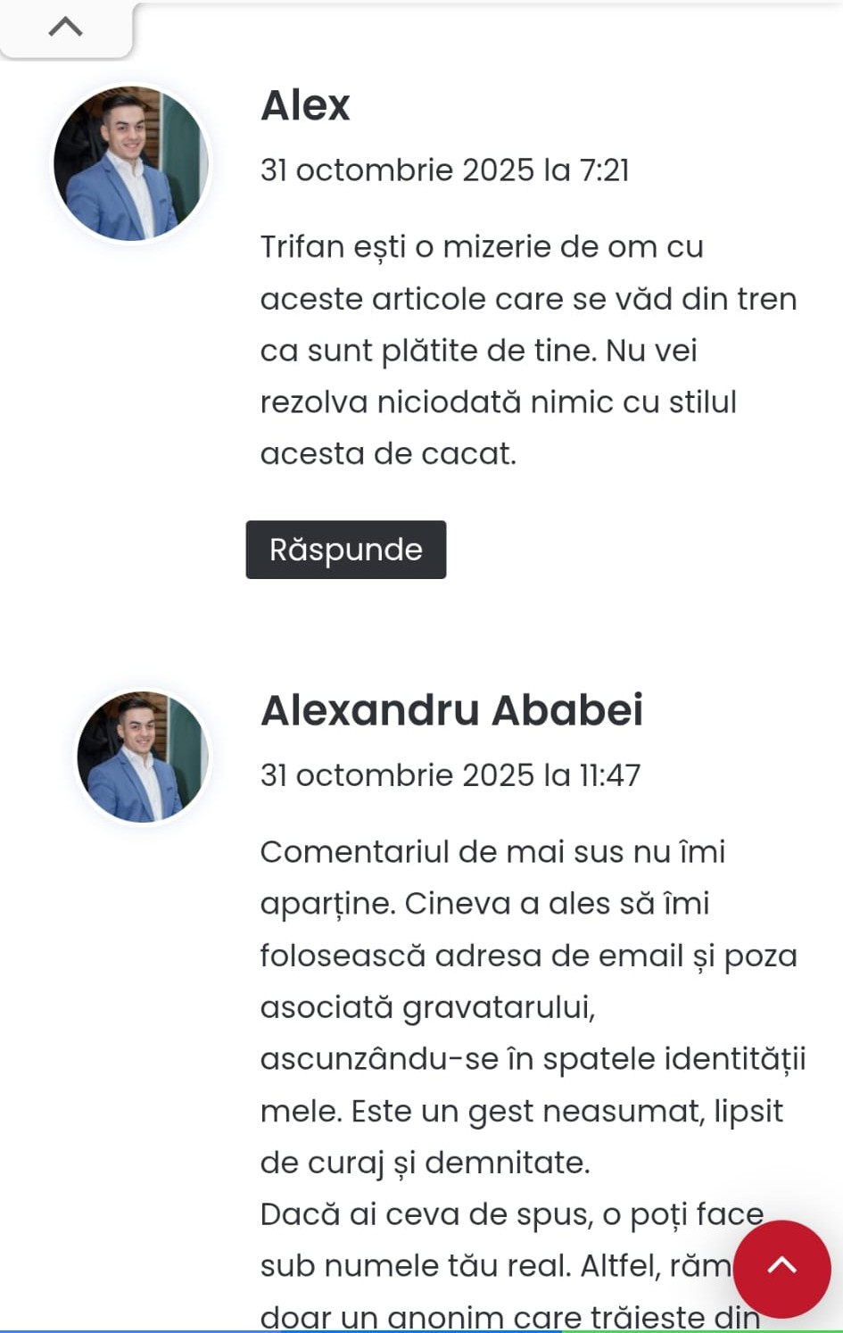 Ce s-a întâmplat de fapt? A fost folosită adresa mea personală de e-mail și poza asociată gravatarului meu, pentru a lăsa comentarii care nu-mi aparțin. O formă mică de impostură digitală, dar una care spune foarte multe despre caracterul celui care a făcut-o.