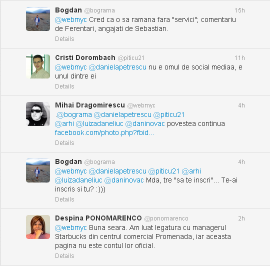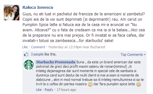 Am văzut pe mai multe bloguri articole despre Starbucks și discuția lor cu o tipă de pe FaceBook. Am vrut să scriu și eu, recunosc, dar lenea nu mi-a dat voie. Se pare că am făcut bine, contul care îi răspundea tipei cu foarte multe greșeli gramaticale și formulări de maro nu e unul oficial.